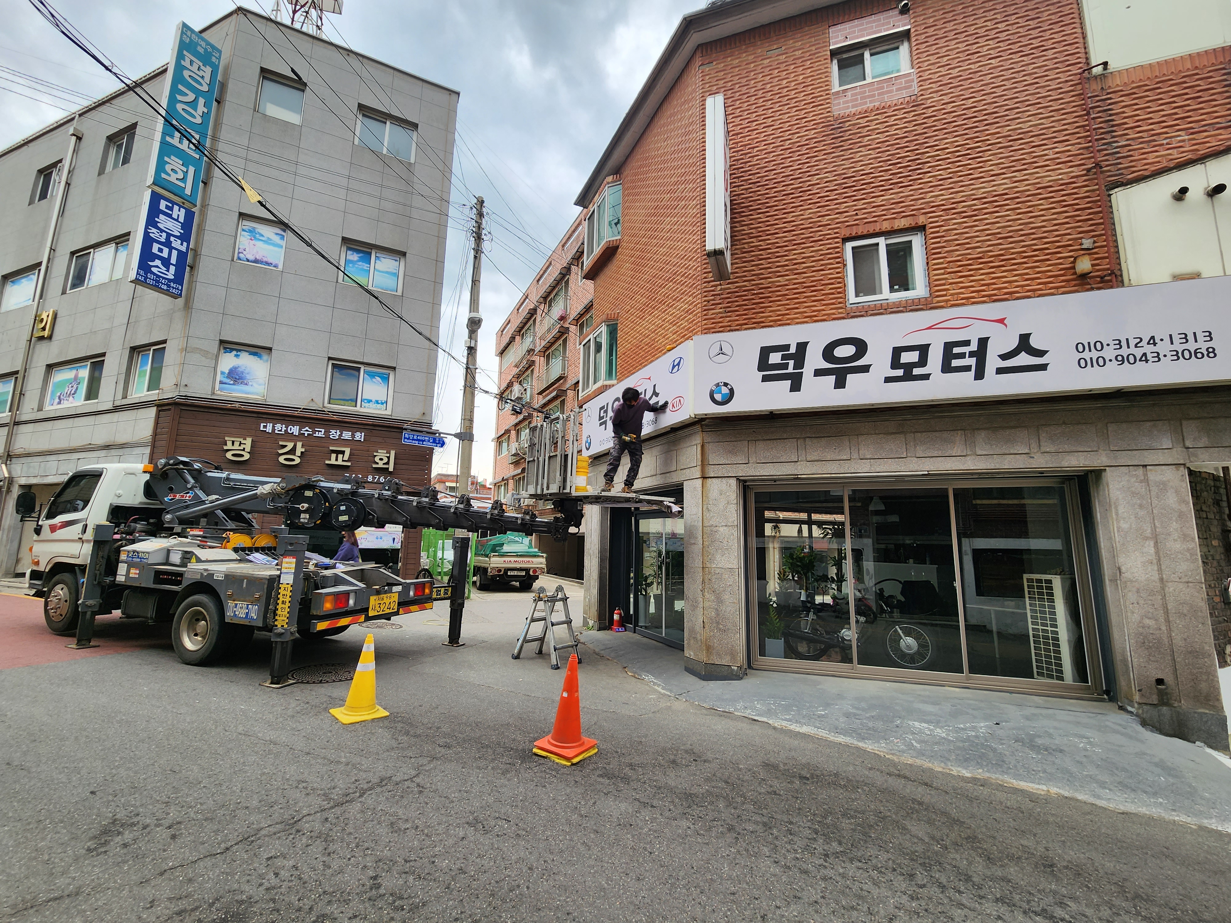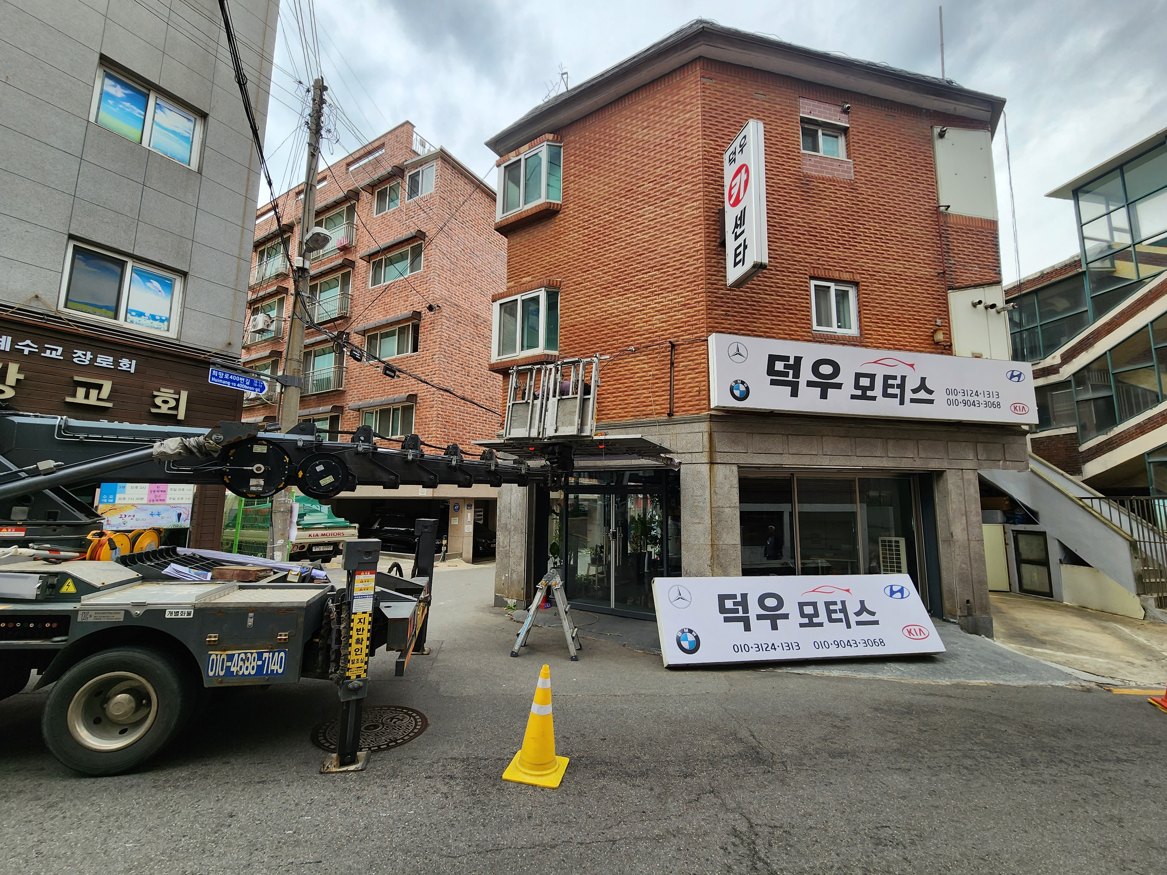 폐기물차와 스카이차가 들어와서 간판을 철거합니다